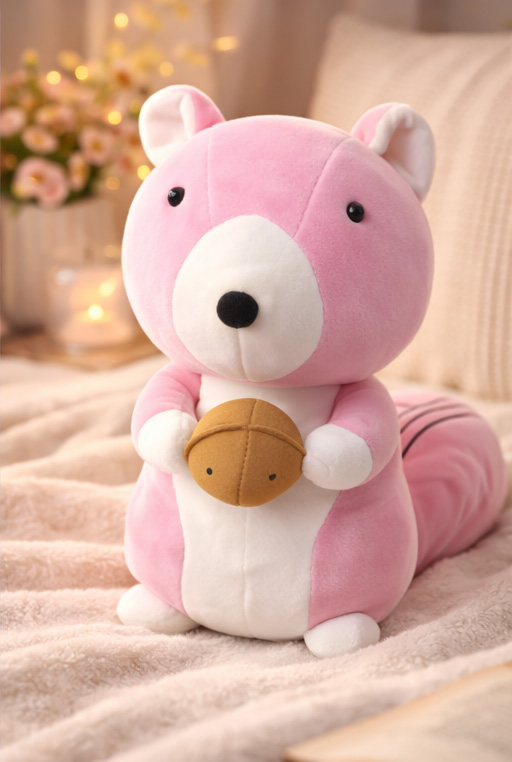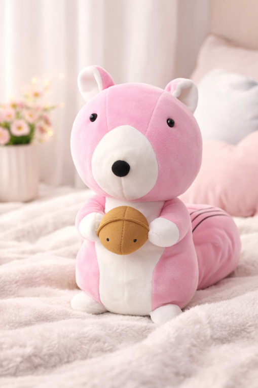 This pink squirrel plush toy stands out for its cute expression and soft-touch fabric finish. Crafted using standard plush materials suitable for everyday use. A thoughtful choice for gifting on birthdays, celebrations, or casual surprises. Its lightweight plush build makes it easy to place on beds, sofas, or shelves. Designed to feel gentle and comforting, it works well as a cuddle companion or decorative soft toy.